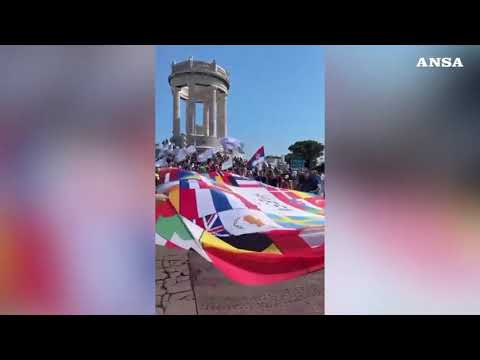 Davanti al Monumento dei Caduti i giovani europei con le bandiere dei loro Paesi