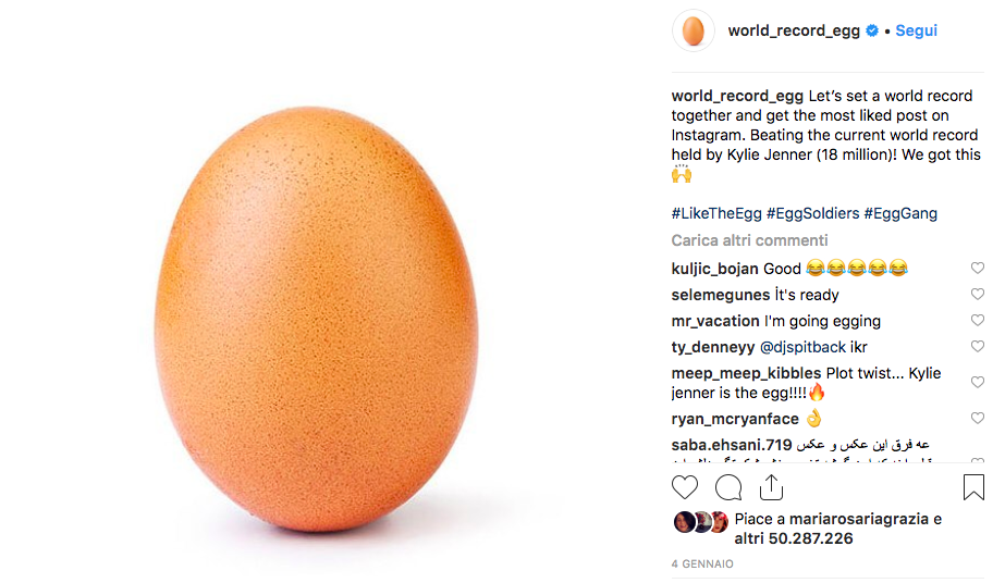 L’immagine di un uovo, caricata il 4 gennaio 2019 da un account chiamato world_record_egg, ha superato i 50 milioni di mi piace su Instagram, diventando l’immagine più apprezzata di sempre.