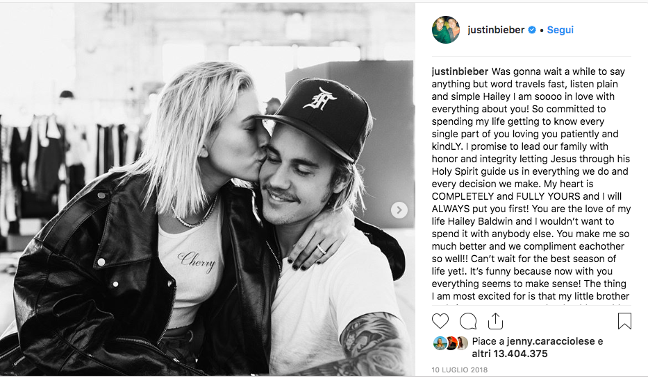 Nel luglio 2018, Justin Bieber confermò il suo fidanzamento con Hailey Baldwin con un adorabile post su Instagram.